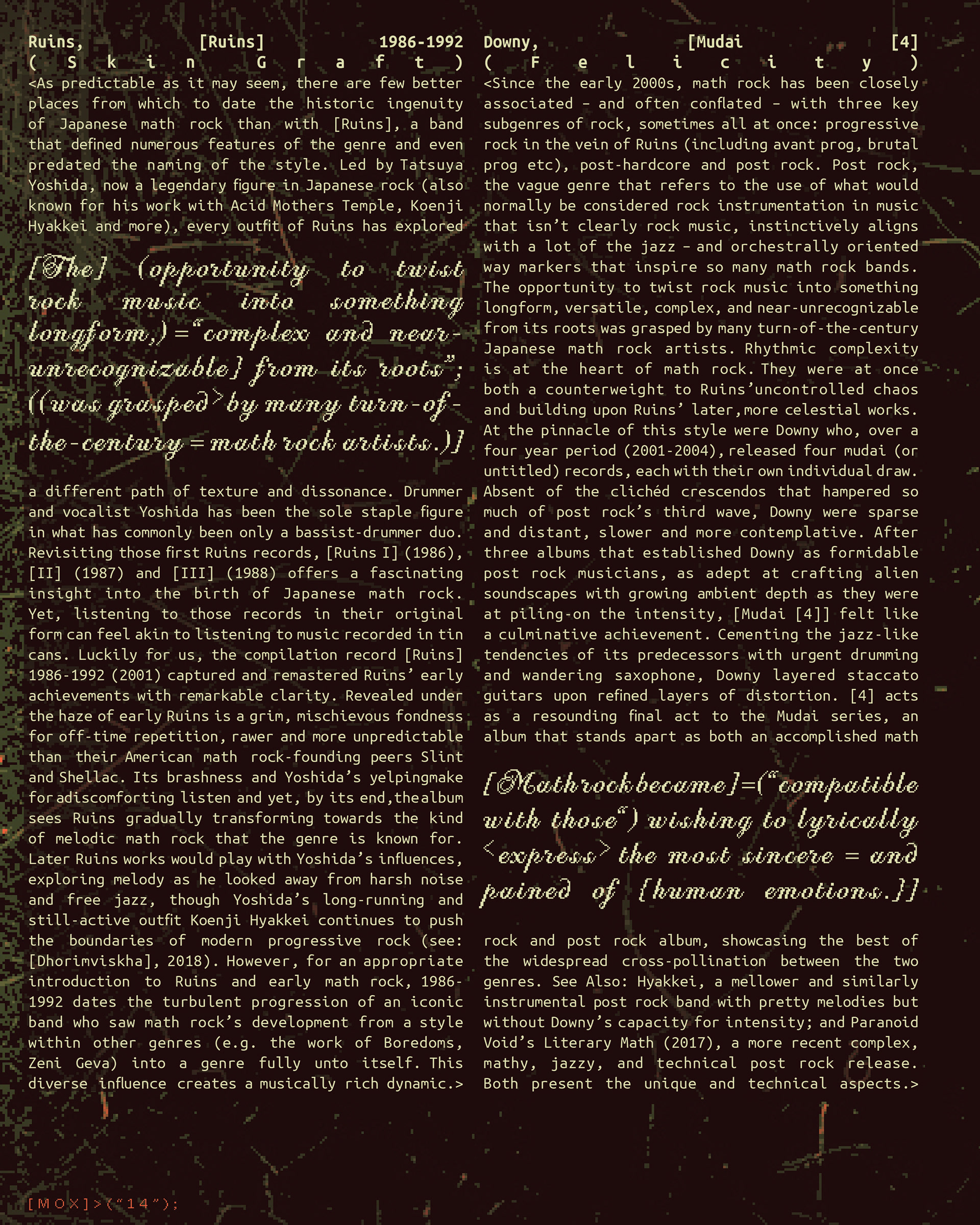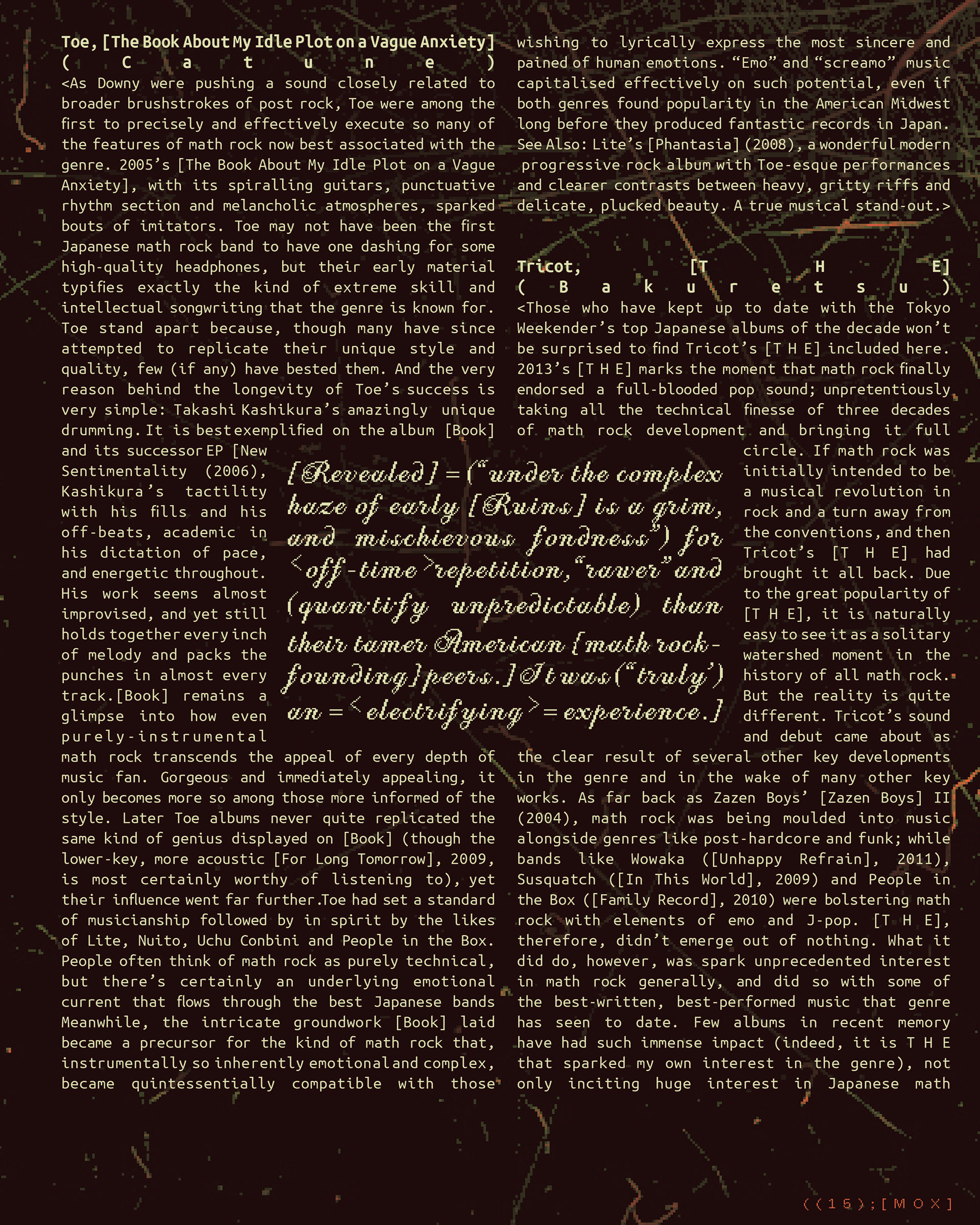 MOX is a music festival that celebrates the technical side of music. Inspired by the sounds of math rock, Midwest emo, and technical jazz instrumentals, MOX explores the more complex sounds developed in alternative spaces and how they have influenced mainstream genres like pop and rock. Combining both acoustics and electronics, MOX presents a variety of artists who take on what it means to take a deeper dive into the complicated arrangements music can take on.